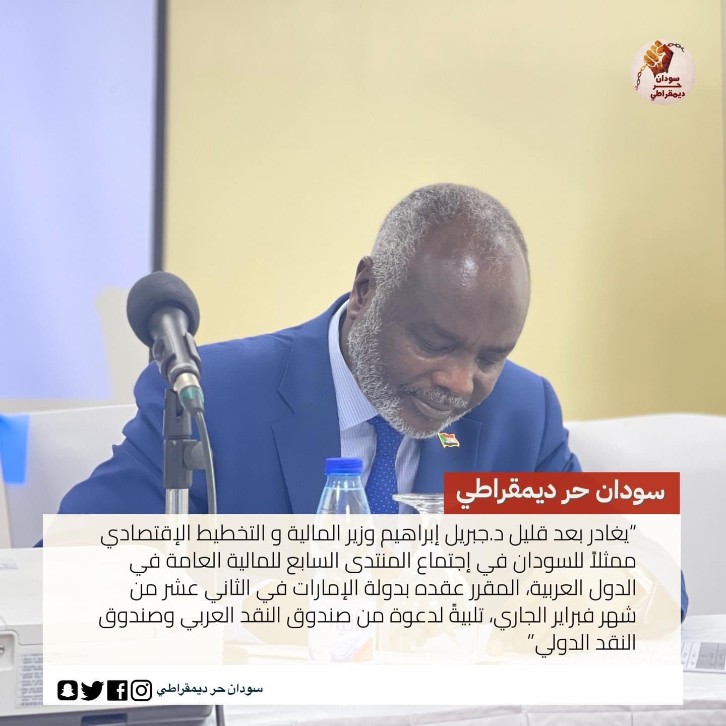 “يغادر بعد قليل د.جبريل إبراهيم وزير المالية و التخطيط الإقتصادي ممثلاً للسودان في إجتماع المنتدى السابع للمالية العامة في الدول العربية، المقرر عقده بدولة الإمارات في الثاني عشر من شهر فبراير الجاري، تلبيةً لدعوة من صندوق النقد العربي وصندوق النقد الدولي”
