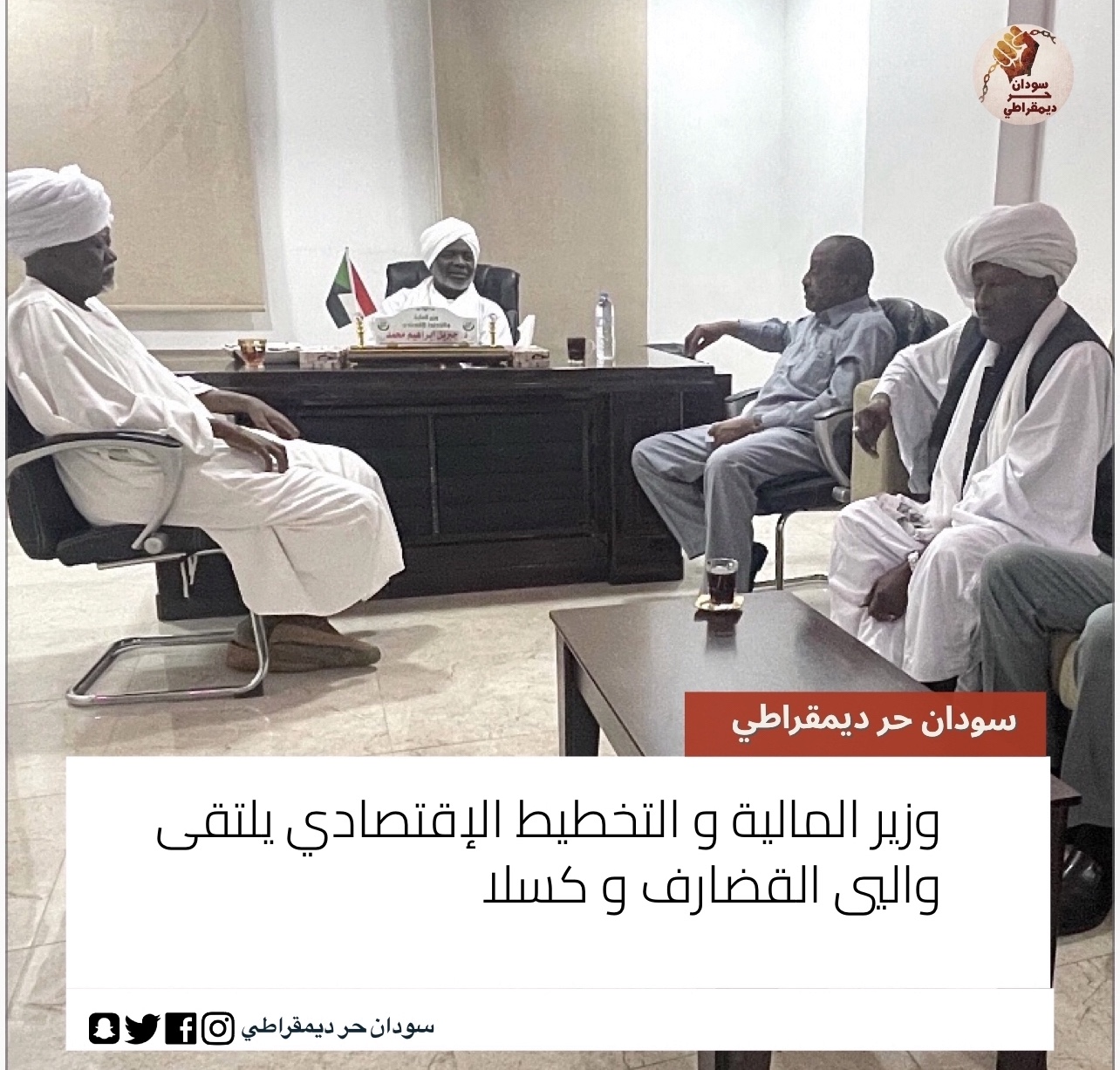 إلتقى الدكتور جبريل إبراهيم وزير المالية و التخطيط الإقتصادي والي ولاية القضارف محمد عبدالرحمن و والي ولاية كسلا في بمعية وزير التنمية العمرانية الأستاذ عبدالله يحيى و وزير الحكم المحلي الأستاذ محمد كورتيكيلا و بحث اللقاء عدد من القضايا المتعلقة بمعاش المواطنين بكلٍّ من ولايتي القضارف و كسلا.