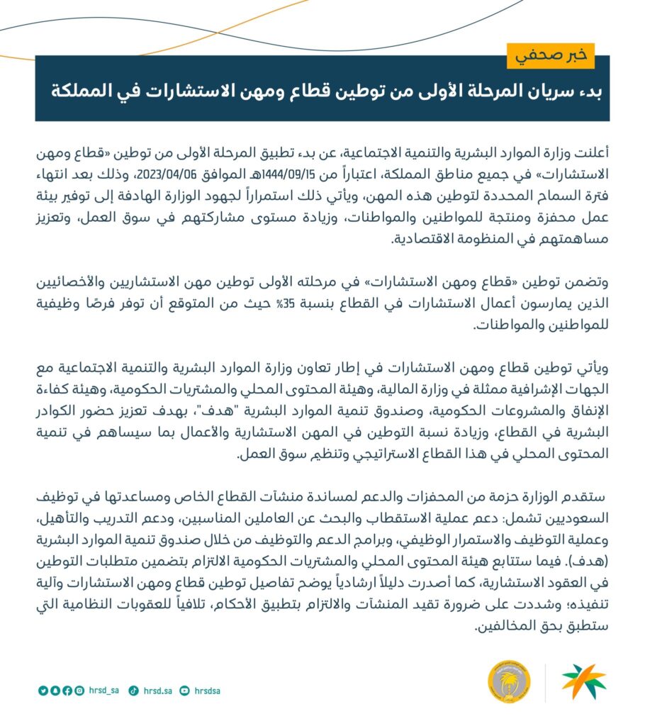 أعلنت وزارة الموارد البشرية والتنمية الاجتماعية، عن بدء تطبيق المرحلة الأولى من توطين قطاع ومهن الاستشارات في جميع مناطق المملكة، اعتباراً من 15 / 09 / 1444هـ الموافق 06 / 04 / 2023، وذلك بعد انتهاء فترة السماح المحددة لتوطين هذه المهن.