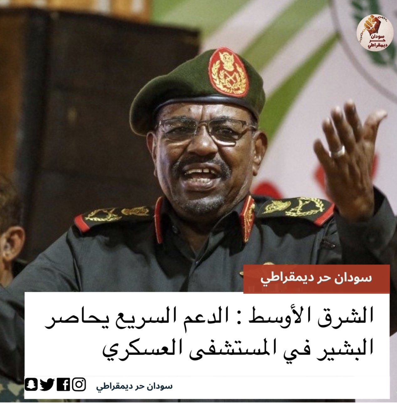 وأكدت مصادر تحدثت لــ«الشرق الأوسط» أن قوات «الدعم السريع» تحاصر الرئيس المعزول عمر البشير، وثلاثة من كبار قادة نظامه، هم بكري حسن صالح، ويوسف عبد الفتاح الشهير باسم (رامبو)، وأحمد الطيب الخنجر، في «مستشفى علياء العسكري» داخل السلاح الطبي في مدينة أمدرمان، الواقع تحت سيطرة الجيش.