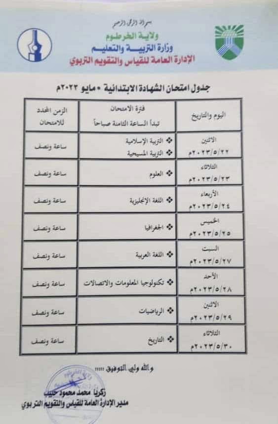 جدول امتحانات الشهادة الابتدائية بولاية الخرطوم لعام 2023