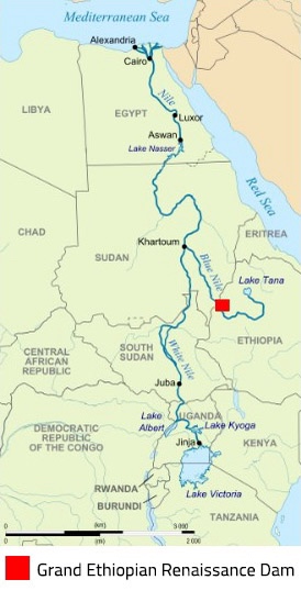 The dam’s construction has caused severe regional controversy, which could flair into a full-fledged war at any time involving the three largest countries of East Africa with a total population of nearly 250 million people. By far the largest, the GERD is one of five dams built on the Blue Nile, which originates in the highlands of Ethiopia at Lake Tana and then flows across the border to Khartoum, where it converges with the White Nile. From Khartoum, the united Nile continues to Egypt, where it supplies over 90% of Egypt’s water needs.