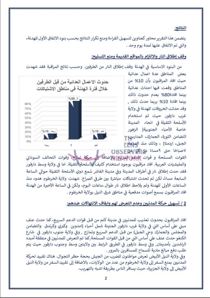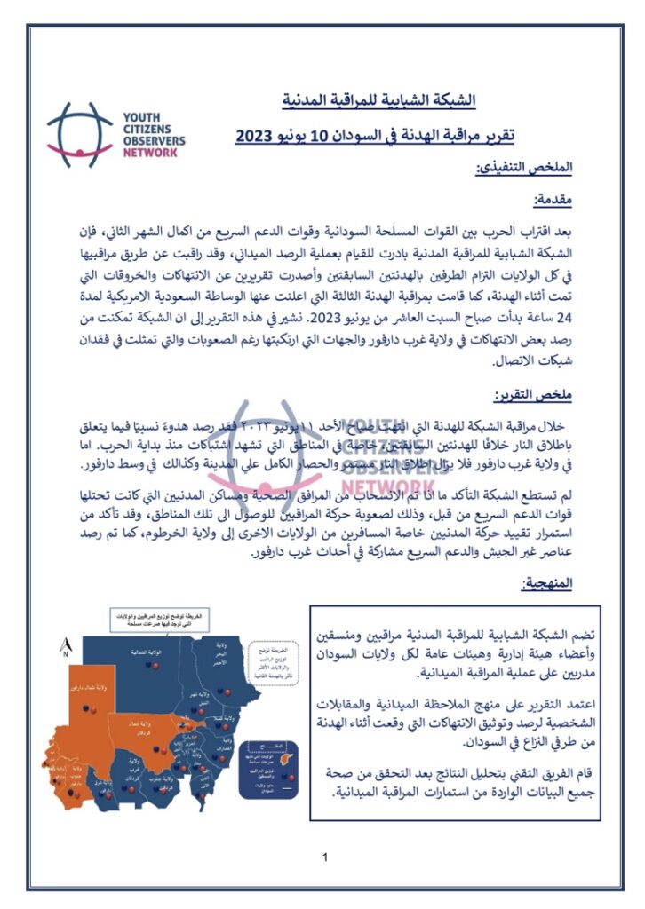 قامت الشبكة الشبابية للمراقبة المدنية و هي شبكة سودانية مستقلة غير حزبية مكونة من مجموعة من المنظمات والكيانات الشبابية التي تهتم بعملية الرصد والمتابعة في السودان، قامت الشبكة بعملية مراقبة للهدنة المعلنة بتاريخ ١٠ مايو لمدة ٢٤ ساعة، أدناه رابط تقرير رصد إنتهاكات طرفي النزاع ضد المدنيين في عدد من الولايات