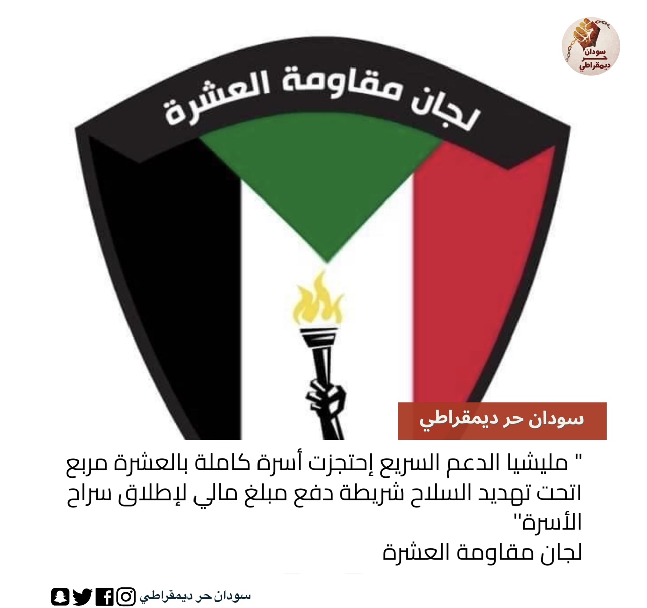 إننا في لجان مقاومة العشرة نحمل مليشيات الدعم السريع كامل المسؤولية عن حياة هذه الأسرة و نطالب بإطلاق سراحهم فوراً بلا قيد أو شرط.