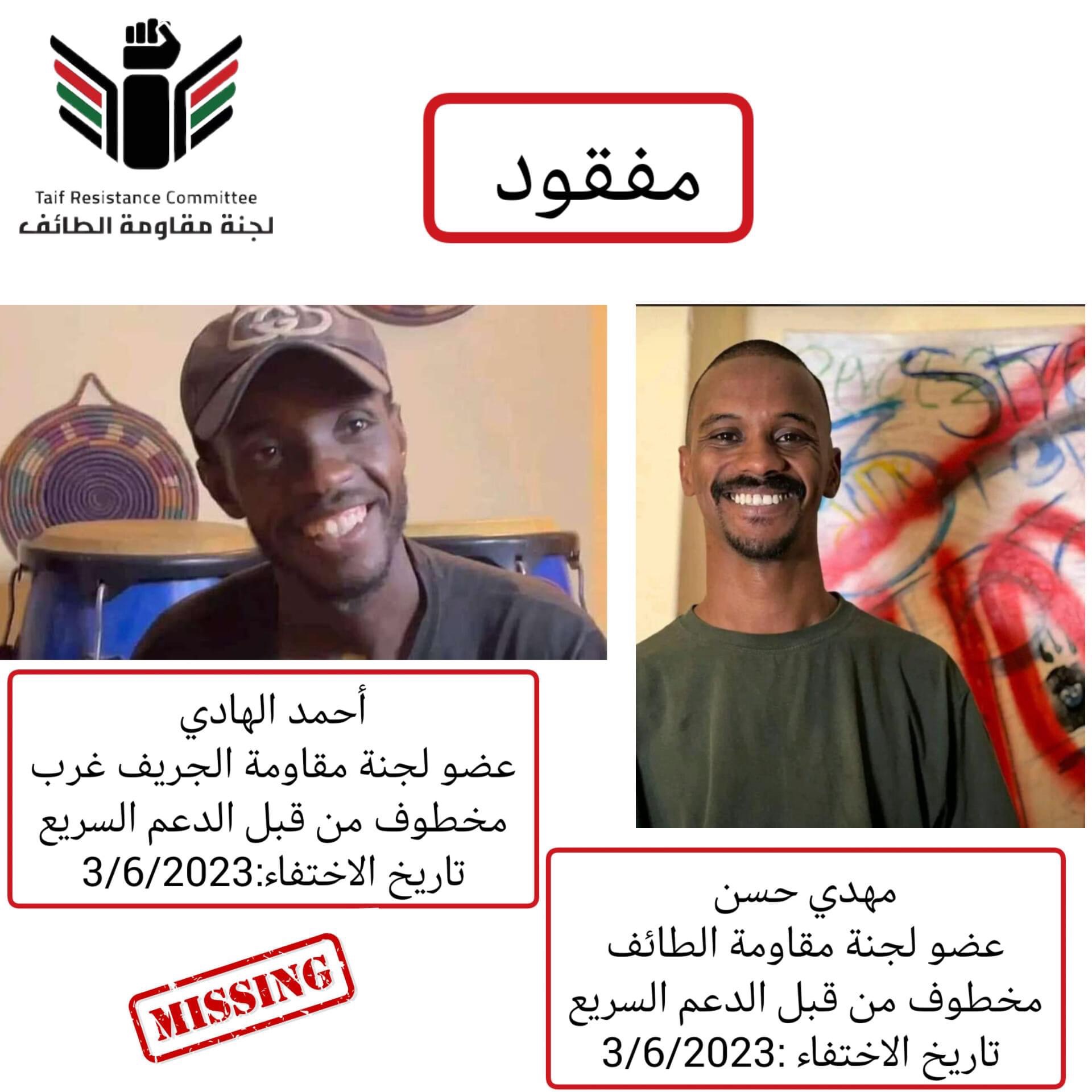 بالأمس قامت مليشيات الدعم السريع باختطاف كل من مهدي حسن الملقب ب “كمون” عضو لجنة مقاومة الطائف و”أحمد الهادي” عضو لجنة مقاومة الجريف غرب أثناء تحركهم إلى منطقة الطائف لاحضار جوازات سفر بعض الأسر في المنطقة، نظرًا لعمل المخطوفين في غرف طوارىء أحياء الجريف غرب والطائف.