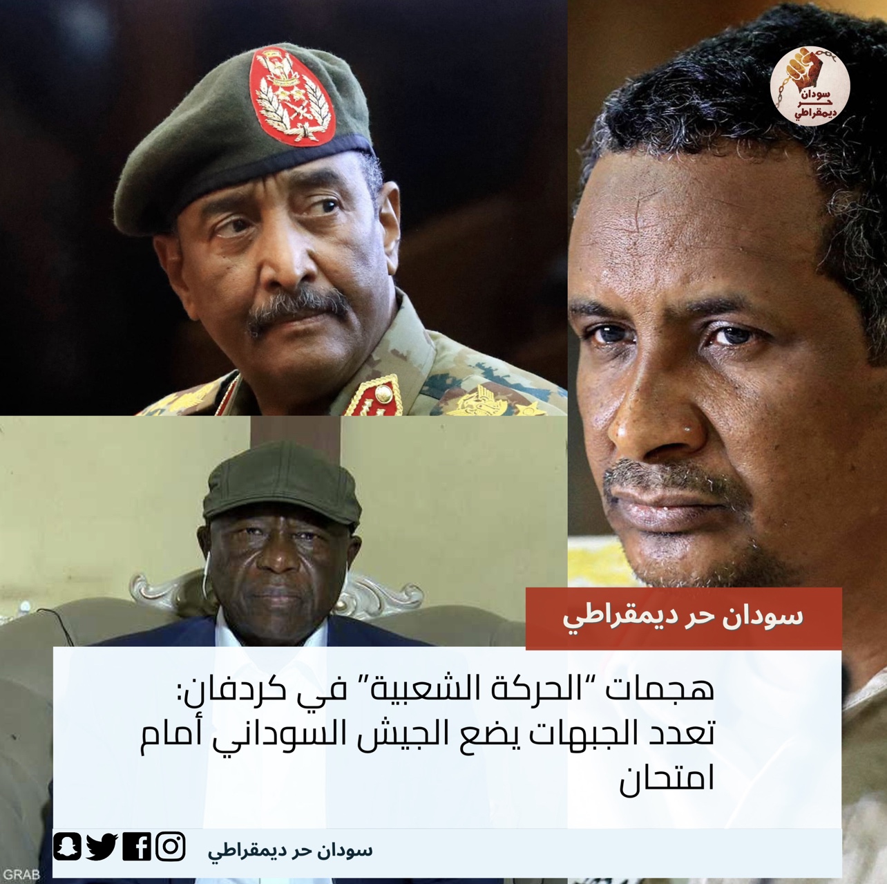 أما اللواء المتقاعد صلاح عيساوي فيرجح حدوث تحالف بين قوات الدعم السريع والحركة الشعبية أساسه بناء دولة جديدة على أنقاض دولة ما بعد استقلال العام 1956 والمسيطر عليها من قبل نخب نيلية، مبينا لـ”العربي الجديد”، أنه يرجح ذلك لأن قادة الحركة أيدوا ما ذهب إليه قائد قوات الدعم السريع الجنرال محمد حمدان دقلو حميدتي، وأوضح ان الجيش سيتضرر كثيرا مما يجري في جنوب كردفان.
