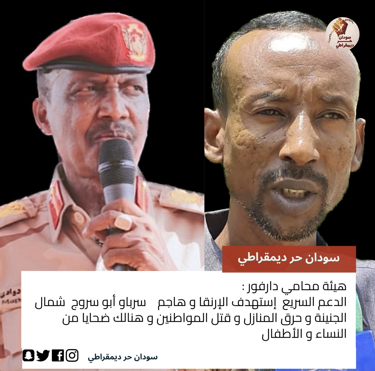 قالت هيئة محامي دارفور في السودان إن “قبائل بولاية غرب دارفور يواجهون قتلًا جزافيًا وتهجيرًا قسريًا ممنهجًا من قبل قوات الدعم السريع والمليشيات المسلحة، في ظل امتناع القوات المسلحة عن حماية المواطنين”.