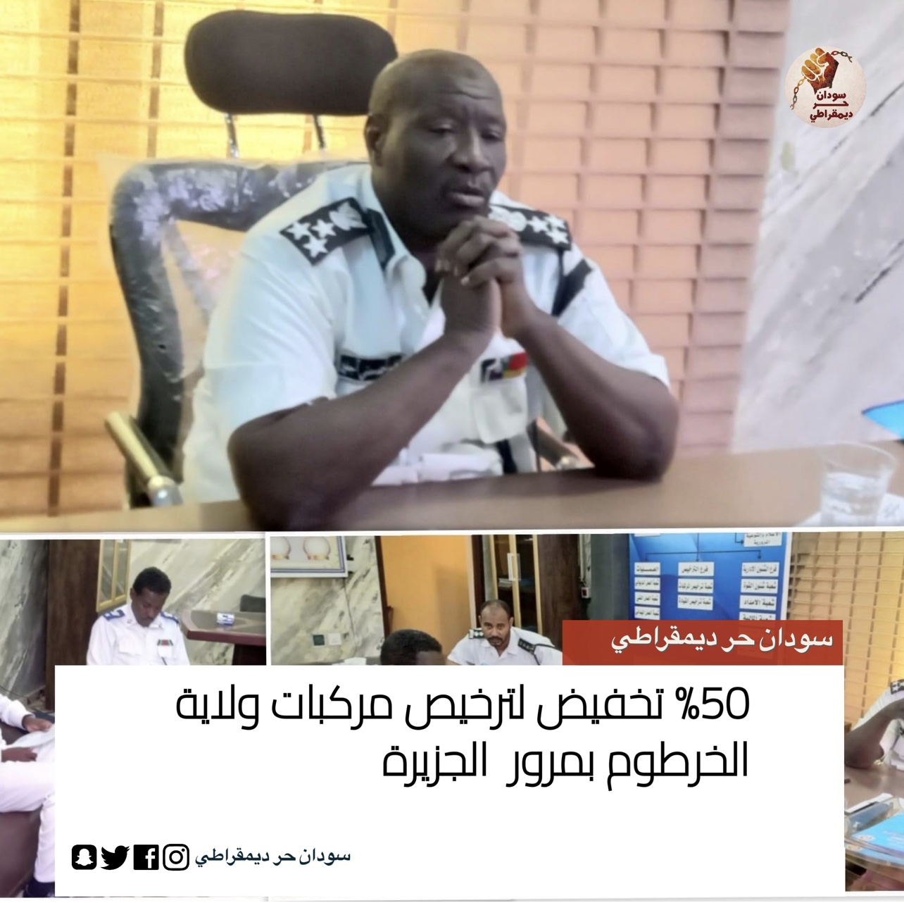 أعلن العميد شرطة خميس أجلين مدير إدارة مرور ولاية الجزيرة عن بداية العمل في تجديد ترخيص مركبات ولاية الخرطوم ورخص القيادة بصالة الترخيص بمدينة ودمدني بتخفيض نسبة 50% من قيمة المعاملات المرورية إعتباراً من اليوم الاثنين 19يونيو2023م إلى جانب إستمرار الترخيص المخفض لمركبات الجزيرة.