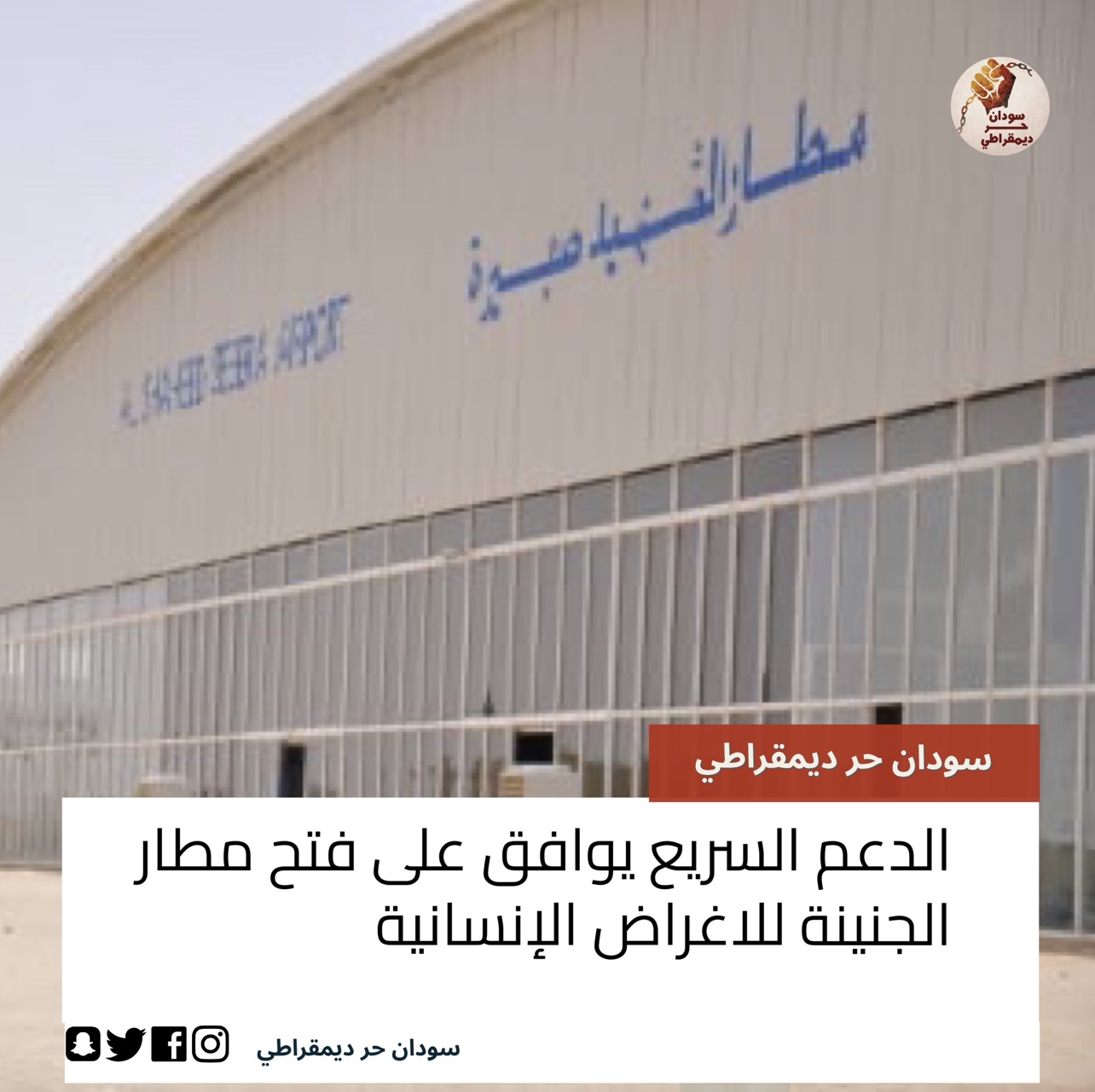 قالت اللجنة المنظمة للاجتماع التشاوري للقيادات السياسية في دارفور الذي اختتم اعماله امس الاثنين في عاصمة توغو ان قوات الدعم السريع وافقت على توصية الاجتماع بفتح مطار صبيرة بمدينة الجنينة لاستخدامه للأغراض الإنسانية، كما اوصى الاجتماع بوقف الحرب وفتح ممرات آمنة للاغراض الإنسانية وانسياب المساعدات الى دارفور بصورة مباشرة عبر مطار صبيرة في الجنينة الذي تسيطر عليه قوات الدعم السريع.