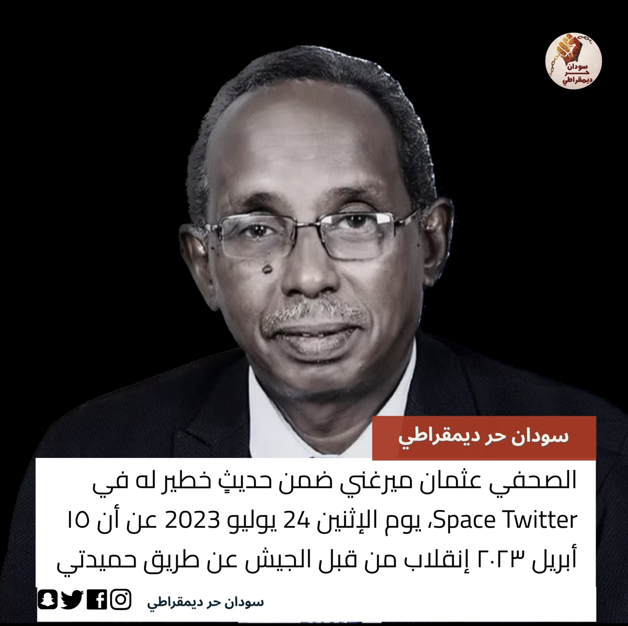 الصحفي عثمان ميرغني ضمن حديثٍ خطير له في Twitter Space، يوم الإثنين 24 يوليو 2023 عن أن ١٥ أبريل ٢٠٢٣ إنقلاب من قبل الجيش عن طريق حميدتي