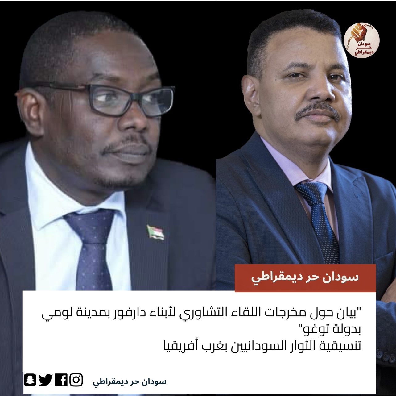 ● هذا اللقاء التشاوري لا ولن يمثل ابناء دارفور ومن شاركوا فيه إنما يمثلون أنفسهم وخدمة مصالحهم الشخصية وسوف لن نصمت جراء تلك الفظائع التي حدثت لأهلنا وبالتالي سنلاحقهم بالجهات العدلية قريبا حتى نقتص منهم للمجنى عليهم.