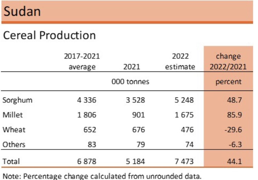 According to the findings of the annual FAO Crop and Food Supply Assessment Mission (CFSAM), the 2022 aggregate production of sorghum, millet and wheat is estimated at about 7.4 million tonnes, about 45 percent above the output obtained in the previous year and 13 percent above the average of the previous five years.