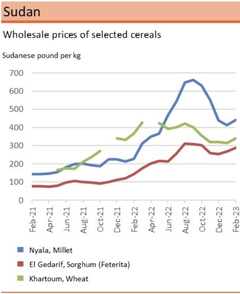 Prices of sorghum and millet declined by 20–45 percent between October and December 2022 with the commercialization of the newly harvested 2022 crops. Subsequently, prices of sorghum seasonally increased by 5‑20 percent between December 2022 and February 2023, while prices of millet followed mixed trends. In February 2023, prices of coarse grains were up to twice their already elevated year‑earlier values.