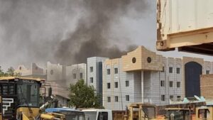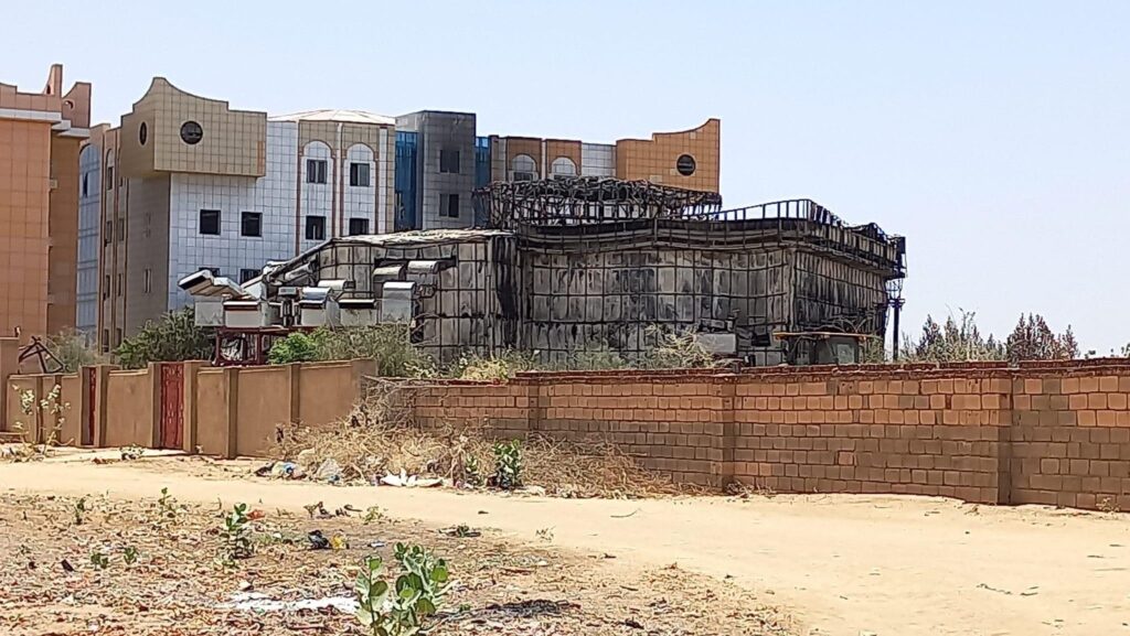 مبني السلطة الإقليمية ، حرق القاعة الكبري ، بالاتجاه الغربي ، وتظهر بالصور ايضاً مبني السلطة القضائية لم تصبها شيئ ،