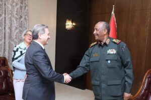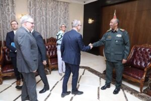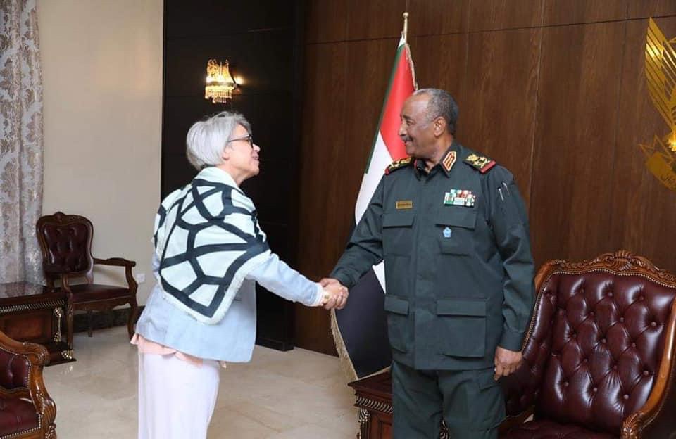 وجدد سيادته، خلال اجتماع عقده بمكتبه اليوم، بمشاركة نائبه الفريق أول محمد حمدان دقلو مع وفد المبعوثين الدوليين الستة، الذي ضم الممثلة الخاصة للإتحاد الأوروبي للقرن الإفريقى أنيت ويبر ونائب مساعد وزير الخارجية الامريكي لشؤون شرق أفريقيا والسودان وجنوب السودان بيتر لورد ورئيس شعبة القرن الأفريقي بالخارجية الألمانية تورستن هوتر والمبعوث الخاص للمملكة المتحدة للسودان وجنوب السودان روبرت فيرويذر والمبعوث النرويجي الخاص للسودان وجنوب السودان جون انطون والمبعوث الفرنسي الخاص للقرن الأفريقي فريدريك كلافيه، جدد إلتزام المؤسسة العسكرية بالخروج من العملية السياسية وإجراء الإصلاحات المطلوبة بالأجهزة الأمنية.