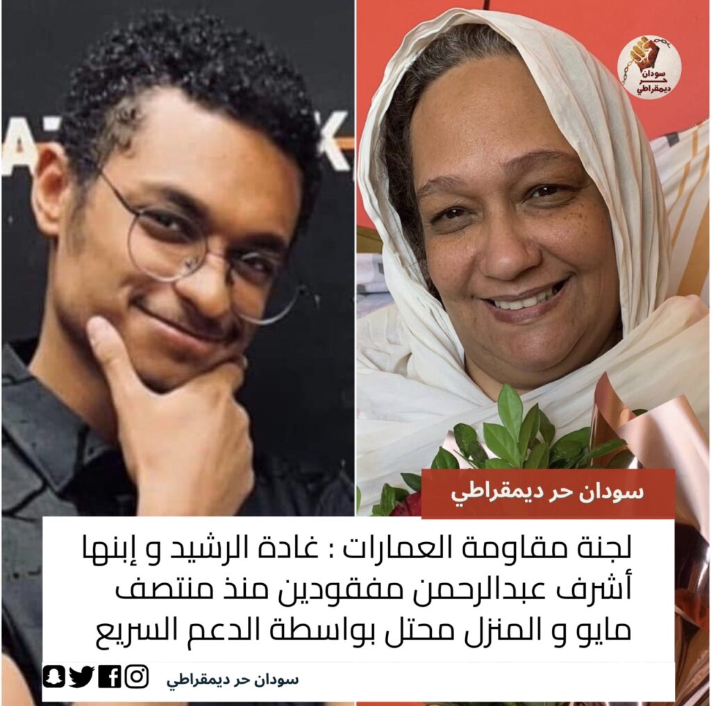 لجنة مقاومة العمارات : غادة الرشيد و إبنها أشرف عبدالرحمن مفقودين منذ منتصف مايو و المنزل محتل بواسطة الدعم السريع