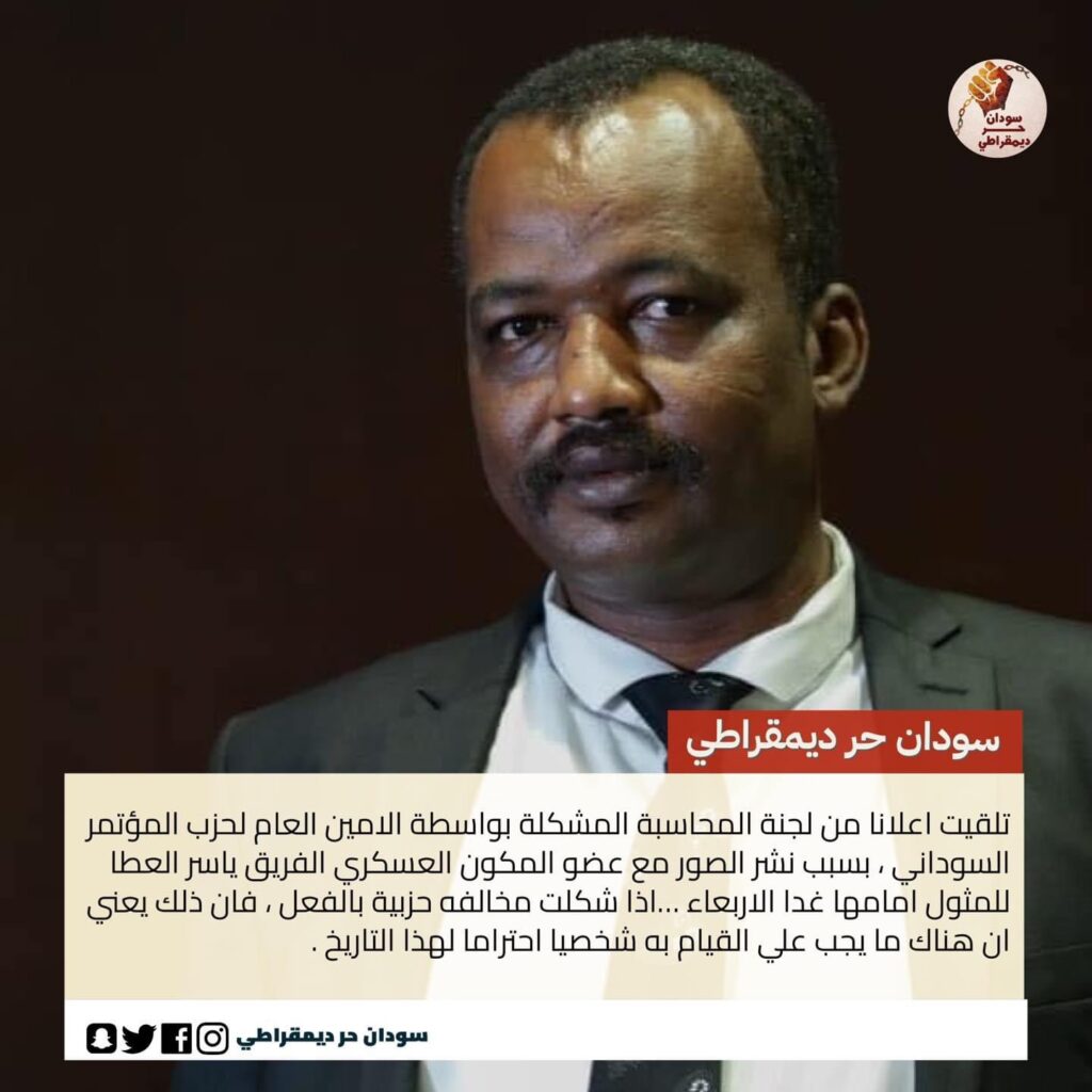 بسبب نشر صورة له مع الفريق ياسر العطا والي شمال دارفور السابق يُلوِّح بالإستقالة من حِزب المؤتمر السوداني