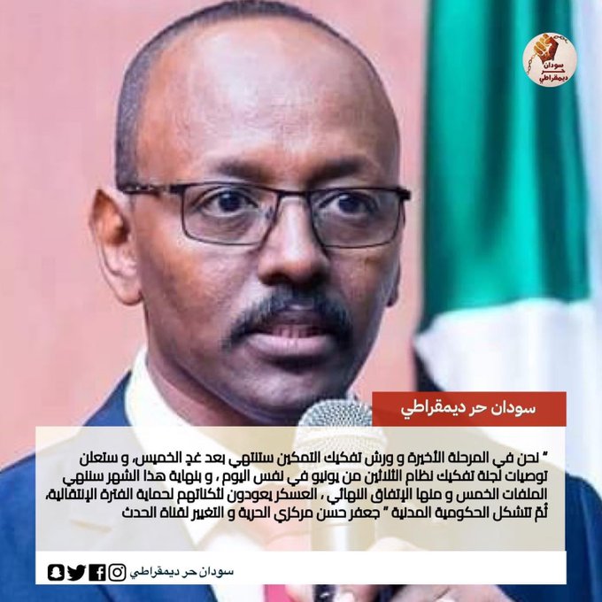 نحن في المرحلة الأخيرة و ورش تفكيك التمكين ستنتهي بعد غدٍ الخميس، و ستعلن توصيات لجنة…