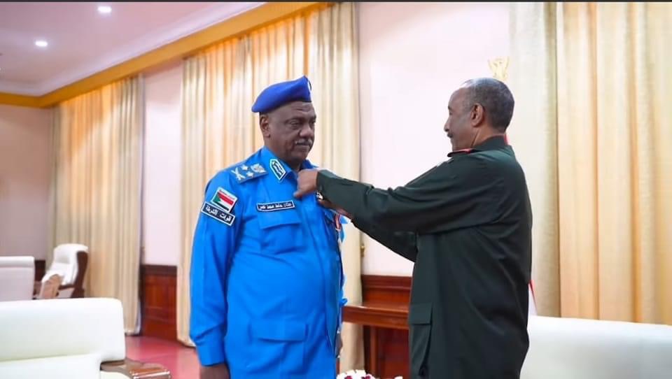 الفريق اول ركن عبد الفتاح البرهان رئيس مجلس السيادة يمنح الفريق اول شرطة (حقوقي) عنان حامد محمد عمر المدير العام لقوات الشرطة وزير الداخلية المكلف نجمة الانجاز .