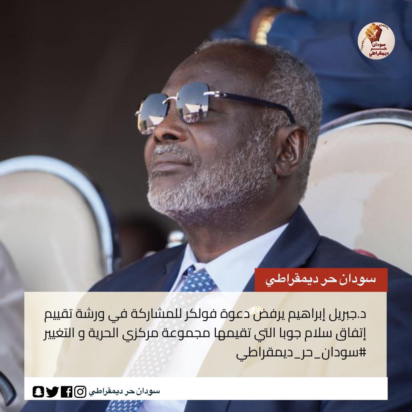 قال د.جبريل إبراهيم نائب رئيس الكتلة الديمقراطية أنه رفض دعوة لفولكر بيرتس للمشاركة في ورشة يوم ٣١ يناير تعدها مجموعة مركزي الحرية و التغيير ، حيث أضاف في تصريح لسودان حر ديمقراطي : ” أخبرت فولكر أن إنحيازكم لجهة بعينها منذ البداية هو الذي أدى لهذا الوضع ، و لن نشارك في ورشة ل”تقييم” إتفاق سلام جوبا و خصوصاً أنها تأتي ضمن مخرجات الإتفاق الإطاري الذي نرفضه جملةً و تفصيلاً ” .