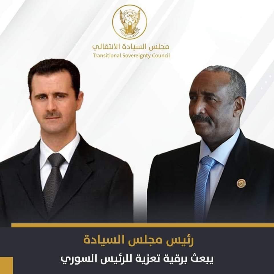 بعث رئيس مجلس السيادة الإنتقالي الفريق أول ركن عبدالفتاح البرهان برقية تعزية للرئيس السوري بشار الأسد. عبر فيها عن مواساة السودان، حكومة وشعبا، للشعب السوري، في ضحايا الزلزال الذي حدث فجر اليوم في مناطق بشمال سوريا.