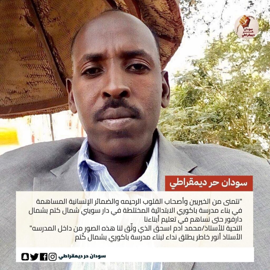 “نتمنى من الخيريين وأصحاب القلوب الرحيمه والضمائر الإنسانية المساهمة في بناء مدرسة باكوري الابتدائية المختلطة في دار سويني شمال كتم بشمال دارفور حتى نساهم في تعليم أبناءنا
