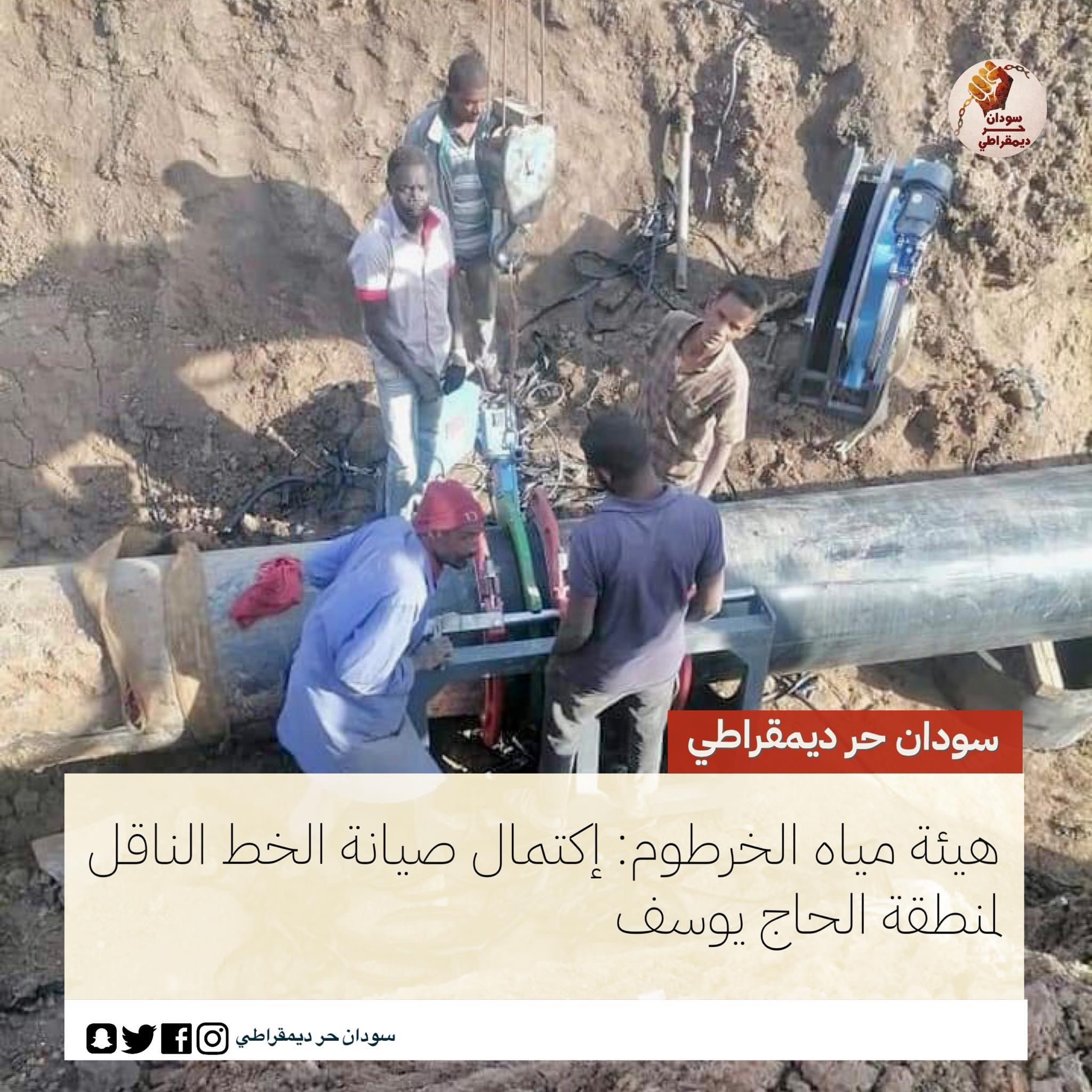 أعلنت هيئة مياه ولاية الخرطوم عن إكتمال صيانة الخط الناقل من محطة مياه بحري المغذي لمنطقة الحاج يوسف قبل لحظات من الآن .