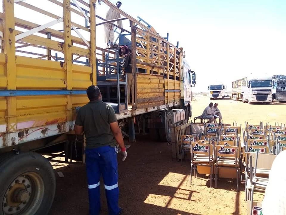 وأضاف محمود ان القافلة تحمل مقاعد اجلاس الثانوي والاساس، التأسيس المكتبي المتكامل لمكاتب المعلمين والزي الدراسي لمراحل الأساس والمتوسط و الثانوي، الحقائب، الاحذية والدفاتر الدراسية، شاشات مشاهدة، صيوانات المناسبات مع كراسي وترابيز مناسبات، بجانب اطقم رياضية وكاسات وميداليات وأحذية رياضية ومرايل تمارين وكور قدم وكور طائرة وشباك وزي حراس مرمى بالإضافة لاجهزة معامل ومجاهر طبية، ميزانات ضغط سماعات أطباء، ميزان أطفال مقياسات حرارة و اوكسجين بجانب فرن تعقيم ولمبات كشف ثلاجات وصهاريج المياه.