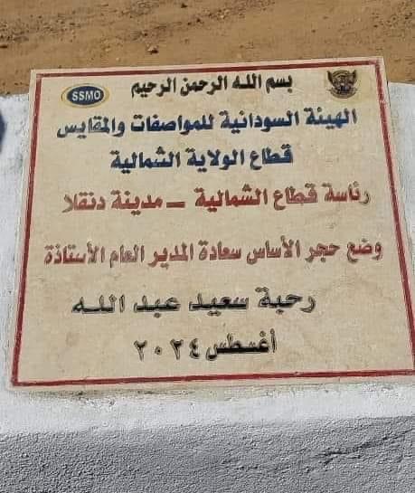 أرسى والي الولاية الشمالية، الأستاذ عابدين عوض الله، والمديرة العامة للهيئة السودانية للمواصفات والمقاييس، الأستاذة رحبة سعيد عبد الله، حجر الأساس لمبنى الهيئة السودانية للمواصفات والمقاييس الجديد بمدينة دنقلا، بمساحة قدرها ١٢٢٥ متراً مربعاً. وحضر الاحتفال عدد من المسؤولين، من بينهم مدير عام وزارة التربية والتعليم بالولاية، الأستاذ التجاني إبراهيم، ومدير الهيئة السودانية للمواصفات والمقاييس قطاع الولاية الشمالية، المهندس عبد العظيم إسماعيل، ومفوض التجارة الاتحادية، الأستاذة حنان أحمد عبد الرحمن.