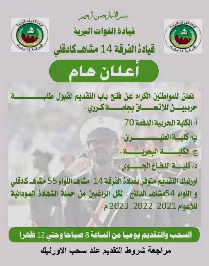 أعلنت قيادة القوات البرية السودانية – قيادة الفرقة 14 مشاة كادوقلي – عن فتح باب التقديم للالتحاق بالكليات العسكرية المختلفة، وذلك للراغبين من حملة الشهادة السودانية للأعوام 2021، 2022، و2023م.