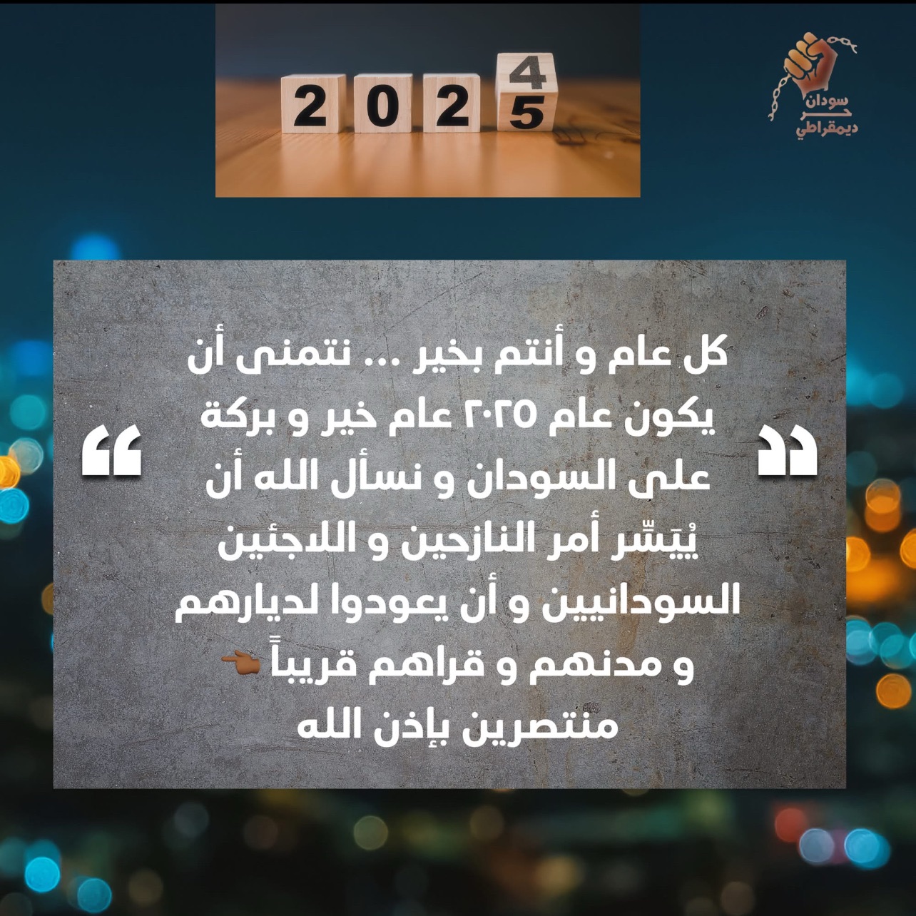 كل عام و أنتم بخير … نتمنى أن يكون عام ٢٠٢٥ عام خير و بركة على السودان و نسأل الله أن يُيَسِّر أمر النازحين و اللاجئين السودانيين و أن يعودوا لديارهم و مدنهم و قراهم قريباً ، منتصرين بإذن الله.