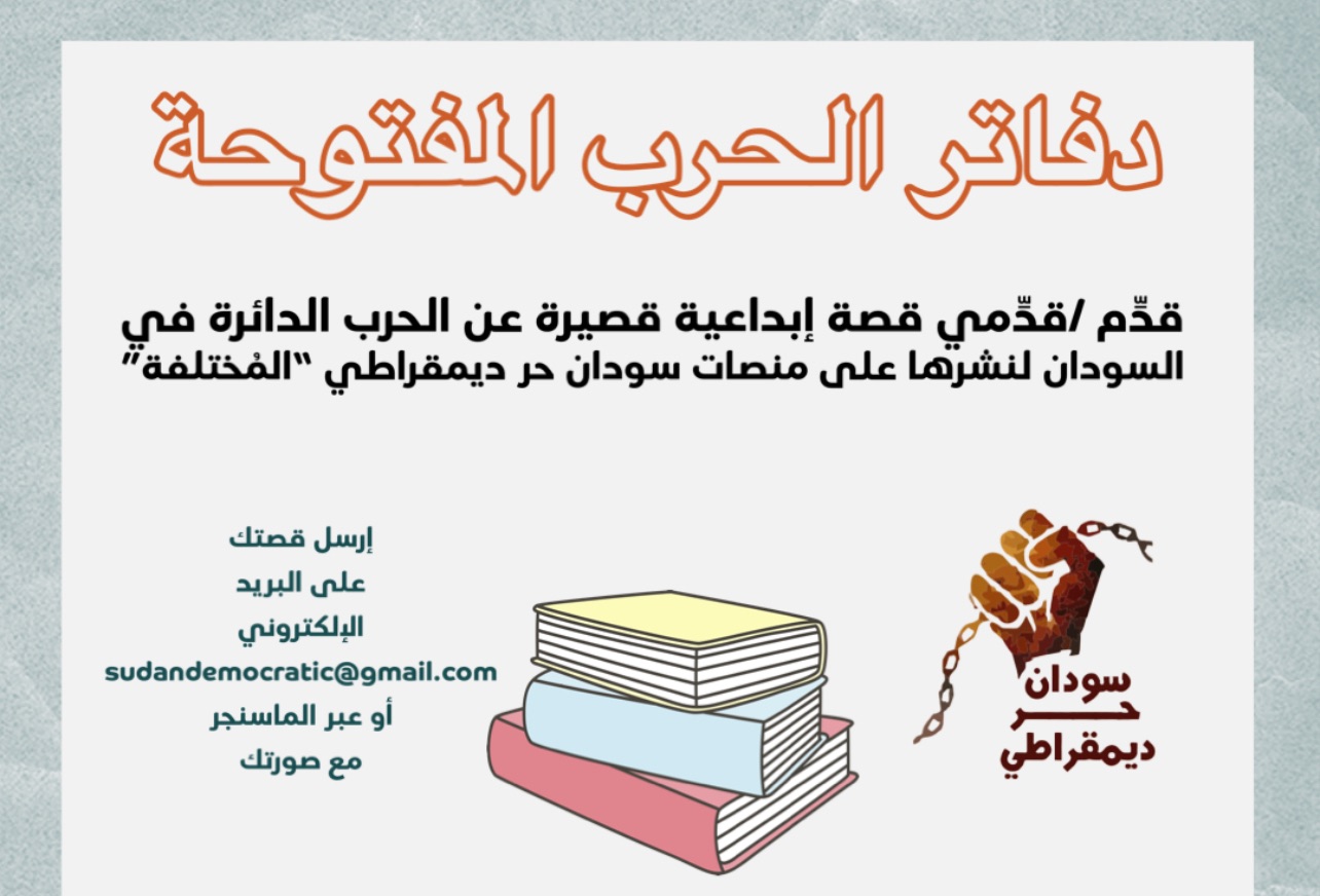 يسر صحيفة سودان حر ديمقراطي الإعلان عن فتح باب المشاركة في كتابة قصص قصيرة ضمن مشروع أدبي جديد و هو سلسلة “دفاتر الحرب المفتوحة ”. ندعو الكتّاب والمبدعين لتقديم قصص مكتوبة بأسلوب أدبي روائي تسلط الضوء على تجارب الحرب وتأثيرها على الأفراد والمجتمعات.. و لكل قصّة عنوان .