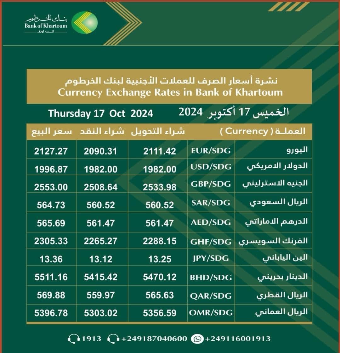 أسعار صرف العملات الأجنبية في بنك الخرطوم ليوم الخميس 17 أكتوبر 2024