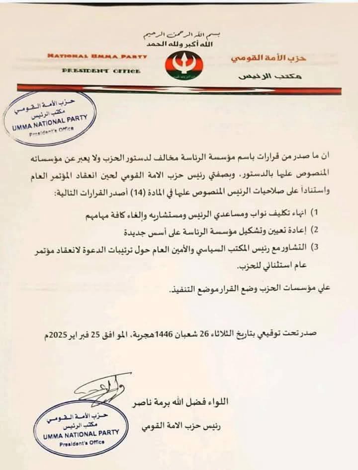 في خطوة مفاجئة، أنهى اللواء فضل الله برمة ناصر، تكليف نوابه ومساعديه ومستشاريه، وأعاد تشكيل رئاسة حزب الأمة، وذلك ردًا على قرار سحب التكليف منه.