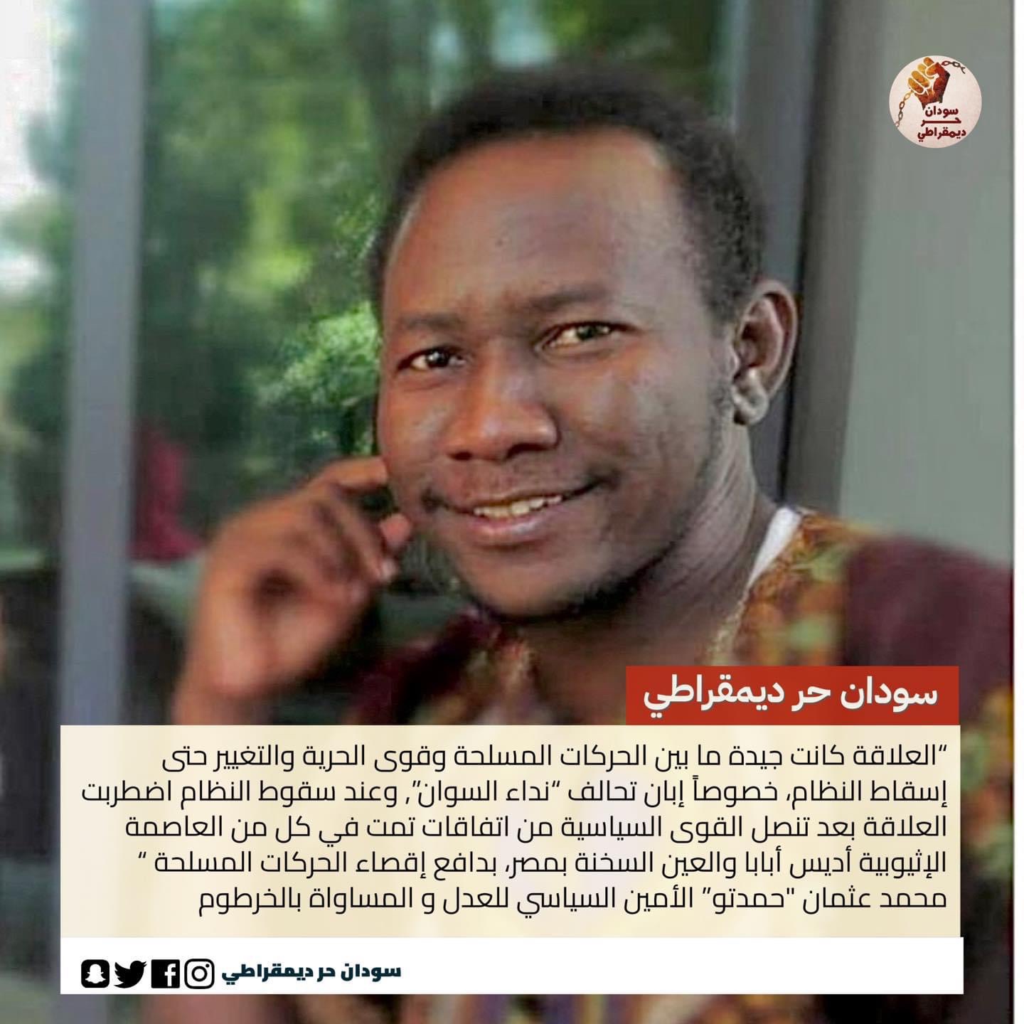 الأمين السياسي لحركة العدل والمساواة بالخرطوم، محمد عثمان “حمدتو” قوى سياسية مدنية “قحت- المجلس المركزي” تحاول إقصاء حركات الكفاح المسلح