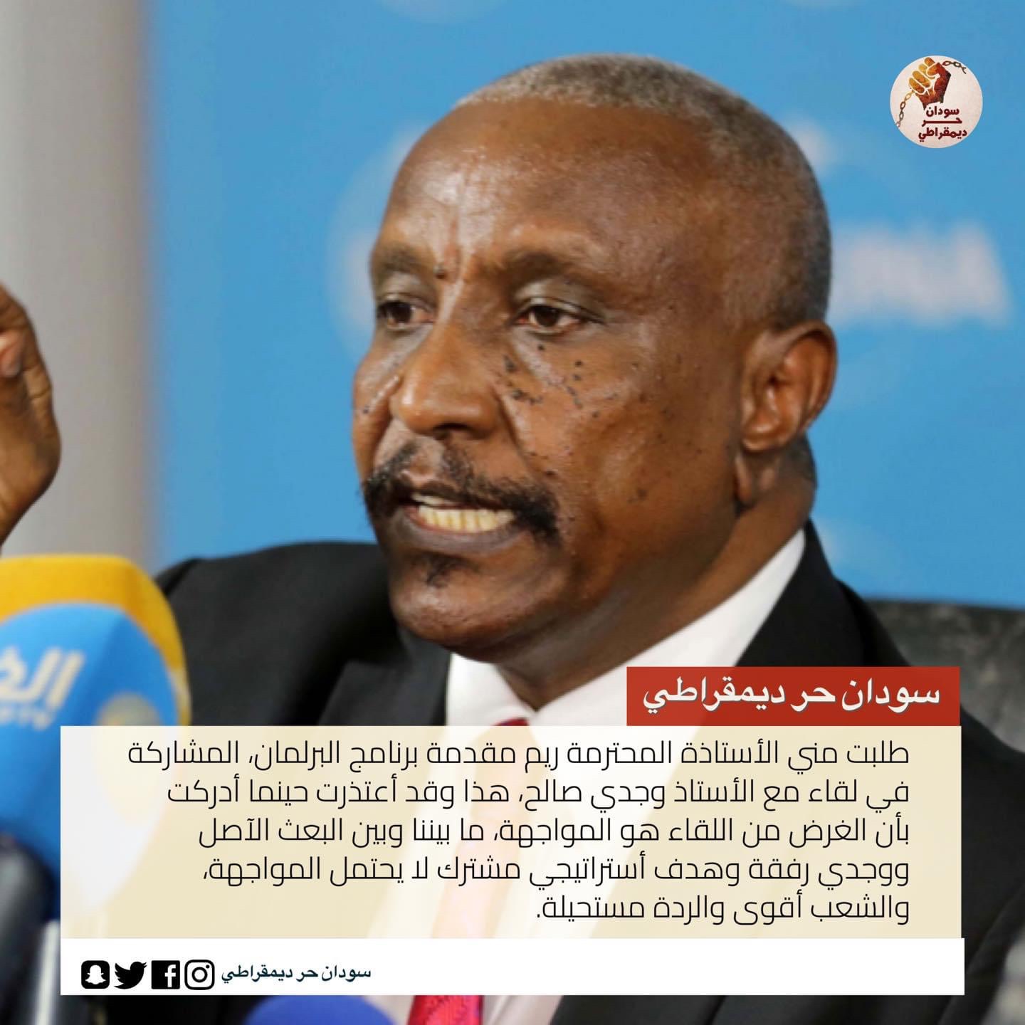 “طلبت مني الأستاذة المحترمة ريم مقدمة برنامج البرلمان، المشاركة في لقاء مع الأستاذ وجدي صالح، هذا وقد أعتذرت حينما أدركت بأن الغرض من اللقاء هو المواجهة، ما بيننا وبين البعث الآصل ووجدي رفقة وهدف أستراتيجي مشترك لا يحتمل المواجهة، والشعب أقوى والردة مستحيلة”