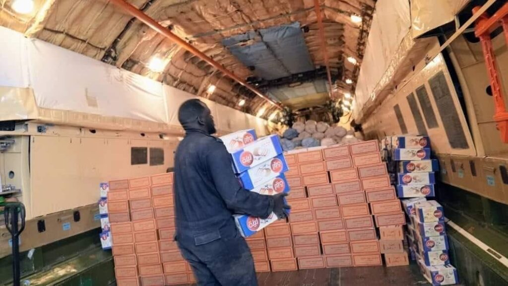 وتحتوي الشحنة على مواد إيواء ومواد غذائية تم تجهيزها بواسطة هيئة إمداد القوات المسلحة ومنظومة الصناعات الدفاعية.