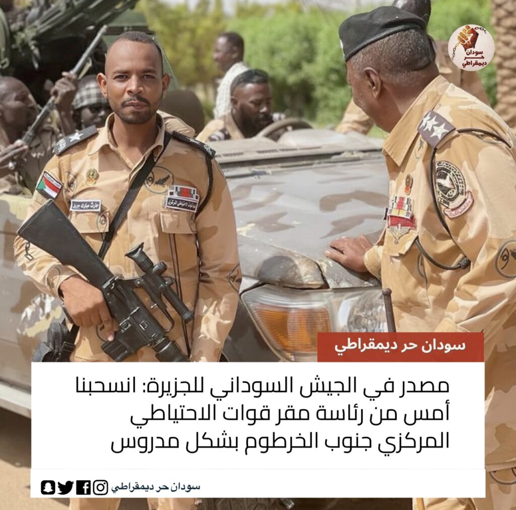 مصدر في الجيش السوداني للجزيرة: انسحبنا أمس من رئاسة مقر قوات الاحتياطي المركزي جنوب الخرطوم بشكل مدروس