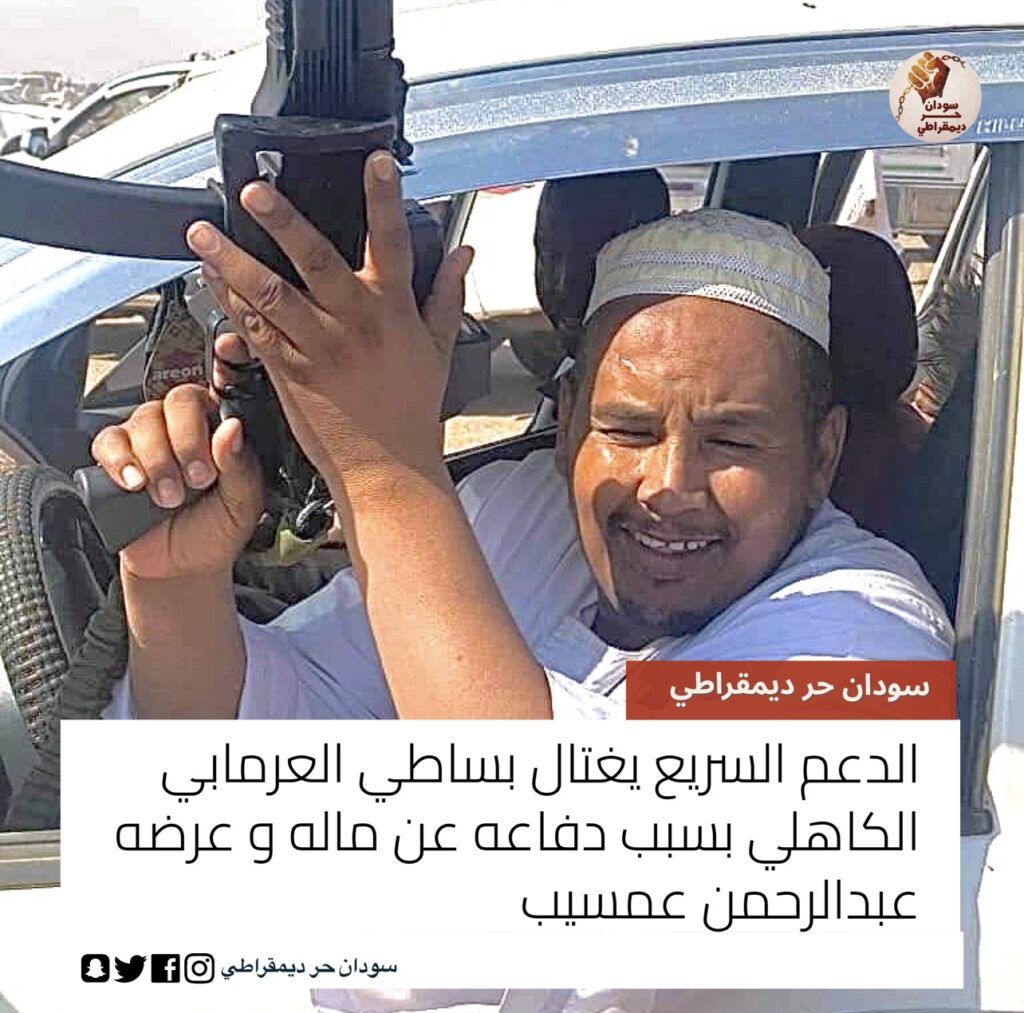 قال الناشط السوداني عبدالرحمن عمسيب أن قوات الدعم السريع إغتالت بساطي العرمابي الكاهلي . و في…