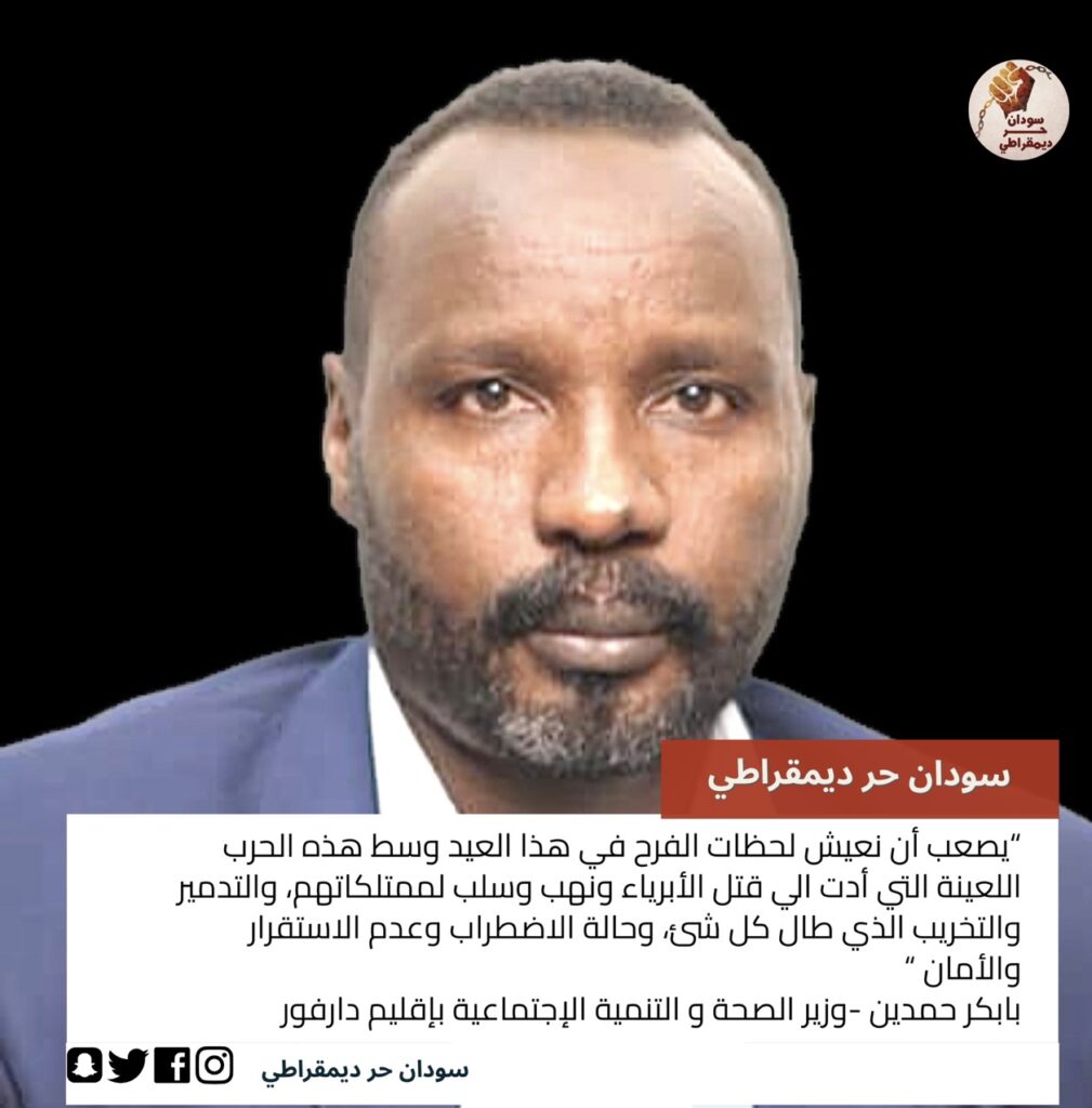 وزير الصحة باقليم دارفور: يصعب أن نعيش لحظات الفرح في هذا العيد وسط هذه الحرب اللعينة التي أدت الي قتل الأبرياء ونهب وسلب لممتلكاتهم