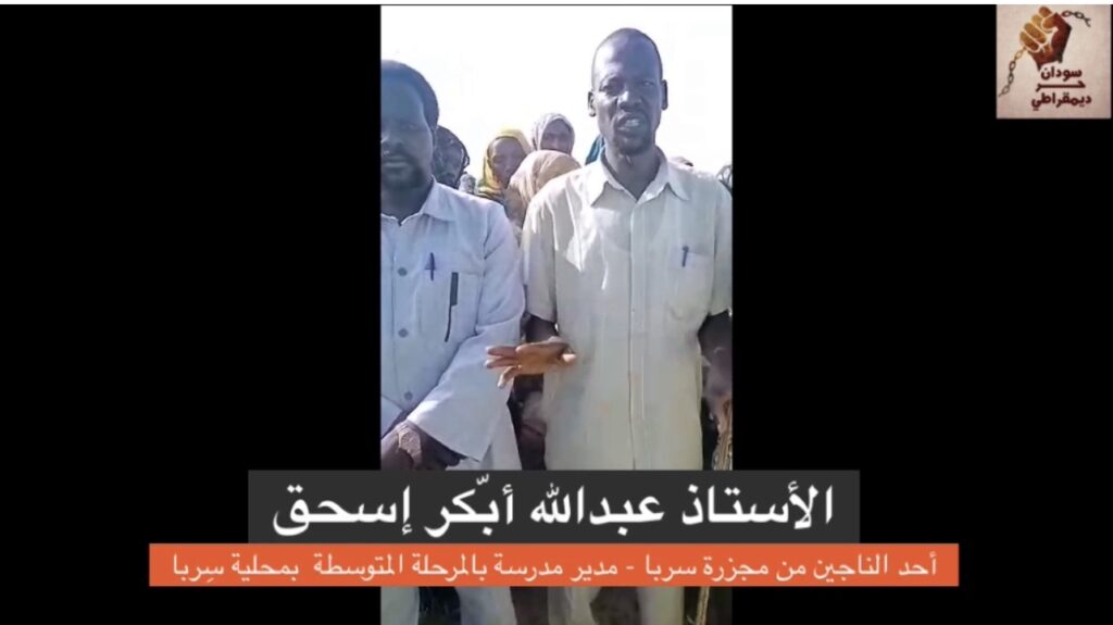 (فيديو) شهادة الأستاذ عبدالله أبّكر إسحق مدير مدرسة متوسطة ..أحد الناجين من مجزرة الدعم السريع بسربا