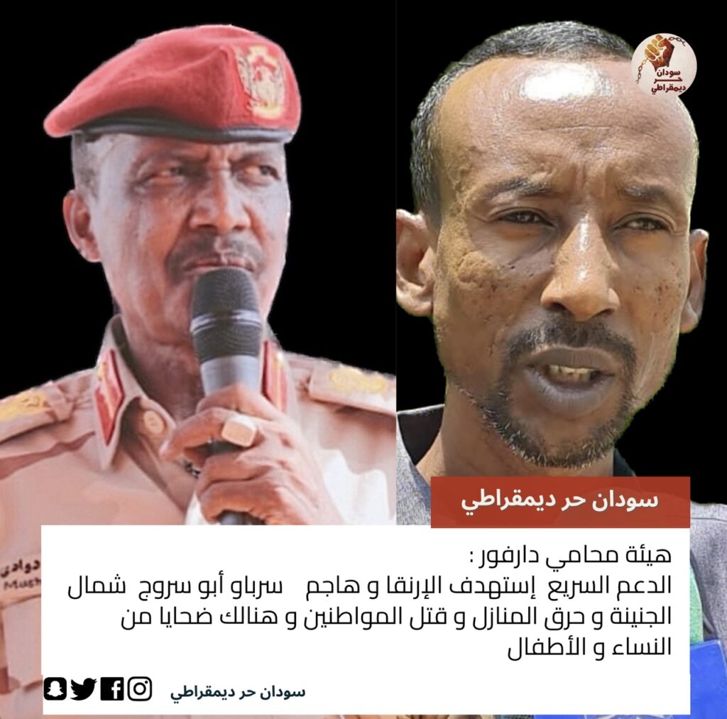 هيئة محامي دارفور : الدعم السريع إستهدف الإرنقا و هاجم سربا و أبوسروج و قتل المواطنين و حرق المنازل